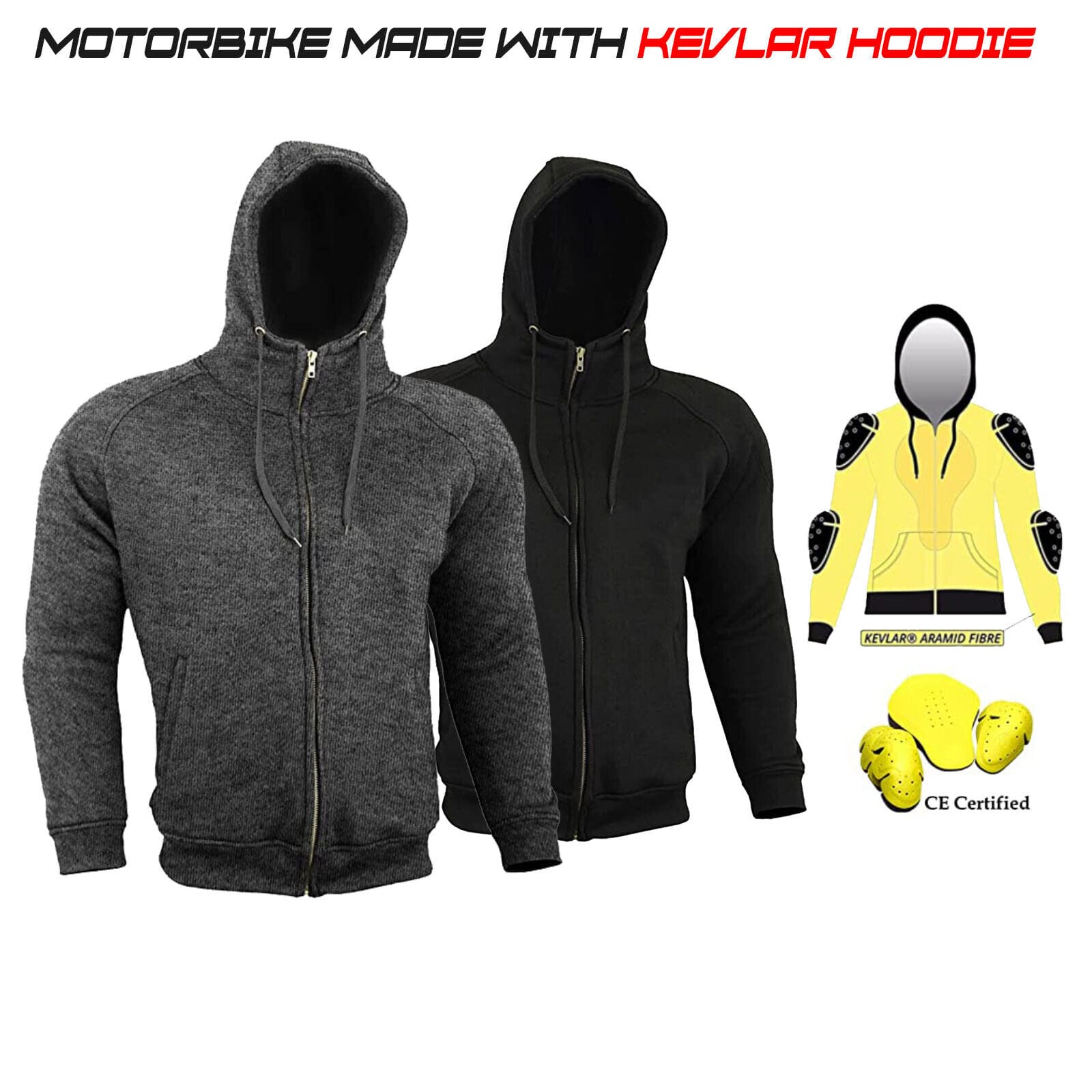 Made from 100% Kevlar lined fleece fabric, approved protectors on shoulders and elbows placed in inner pockets with velcro closure to keep the protection in position in case of an accident. Adjustable protection up to level 2 with secure and easy access velcro pockets. The first fleece motorcycle jacket that looks as good as a regular fashion jacket, so no matter where you are, on or off the bike you will look casual, making it perfect for riders who like to get out and ride around town without the bulk of leather High density versatile hoodie – specially designed to give a smarter look with the necessary protection Fleece and Lycra stitching on cuffs and hem. High quality YKK zipper. Can be used for all kinds of use because all armor is removable. High quality YKK zipper. 2 zippered pockets and one inner pocket. Machine washable Soft touch and 100% fleece fabric. It can be used for all kinds of use because all the armor is removable